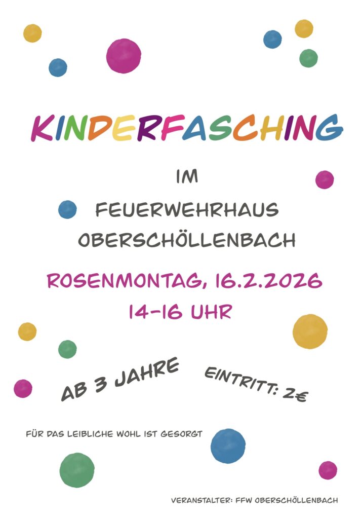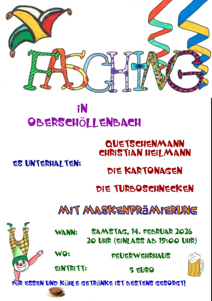 News: 14. Februar Fasching im Feuerwehrhaus um 19 Uhr16. Februar Kinderfasching im FW-Haus um 14 Uhr Übungstermine der Aktiven 2026Verein Termine 2026Programm der Kerwa 2026Übungstermine der Jugendfeuerwehr 2026 Homepage Beiträge in den verschiedene Jahren: (einfach auf den Roten Button drücken) Homepage 2014 bis 2020 Homepage 2021 bis 2025 Homepage Beiträge ab den Jahr 2026 Kinderfasching im Feuerwehrhaus 2026 Faschingstanz Oberschöllenbach